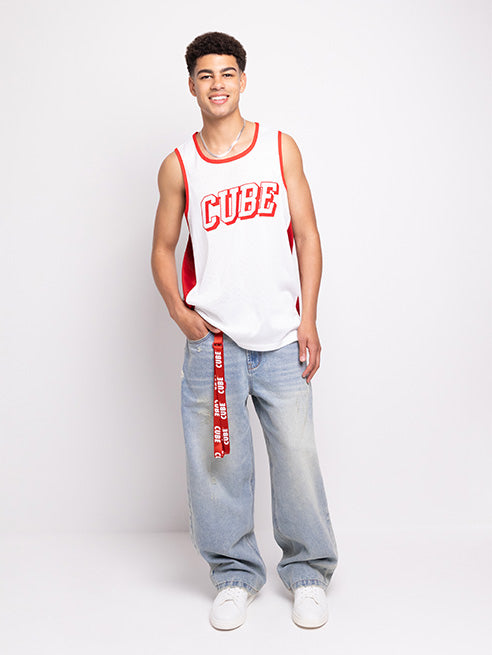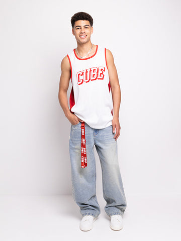 Stay connected in style with this bold red cellphone lanyard. The repeated 'CUBE' print in...